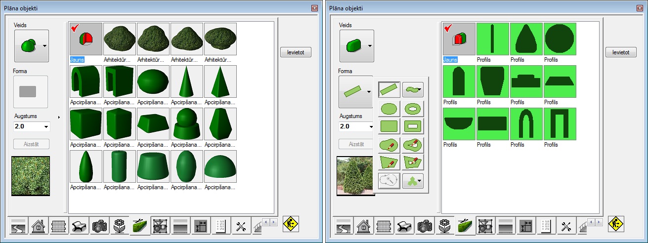 Ar redaktora palīdzību var izvēlēties dzīvžoga vai veidojamā auga formu un ievietot to plānā. Zemsedzes augu stādīšanas/augšanas laukumus iespējams aizpildīt ar attiecīgā auga tekstūru.
